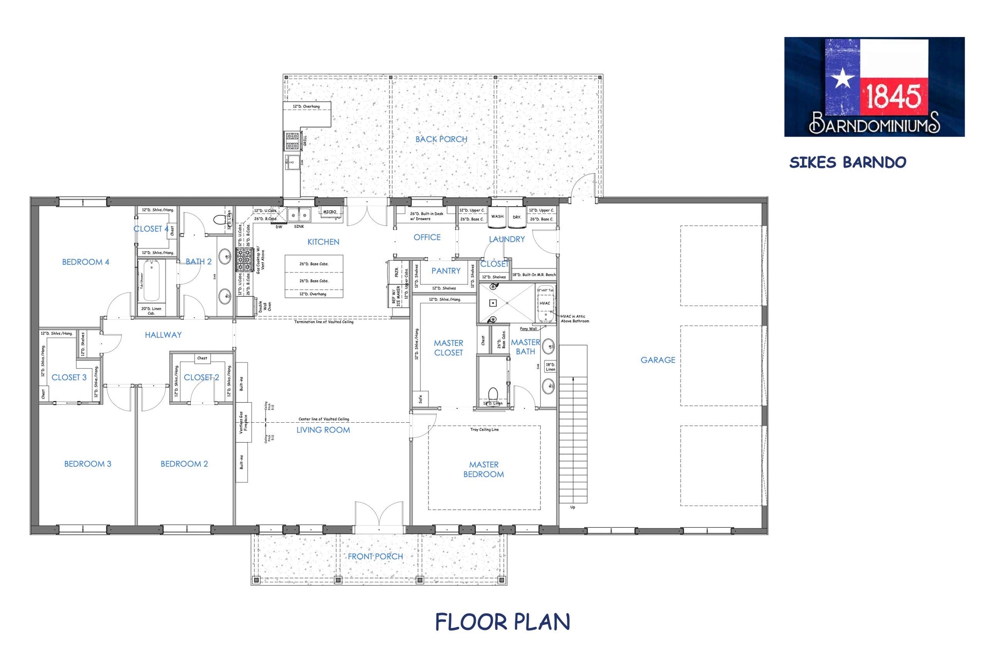 The Sikes floorplan is a 4 BR / 2 BA layout at 2777 sq ft. This plan includes an attached 3 car garage, spacious master suite, and an open-concept layout, all under one roof! There is plenty of room for hosting in this large living room and large kitchen area.If you have any questions, or would like to purchase a "Modified" floor plan, please contact us: sales@team1845.com.
